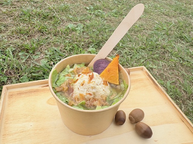 大きな鶏団子に季節の葉物野菜がたっぷり入った塩味ベースのスープと、キノコやカボチャ・芋・ブロッコリーなどがはいったミルクベースのスープが選べます。